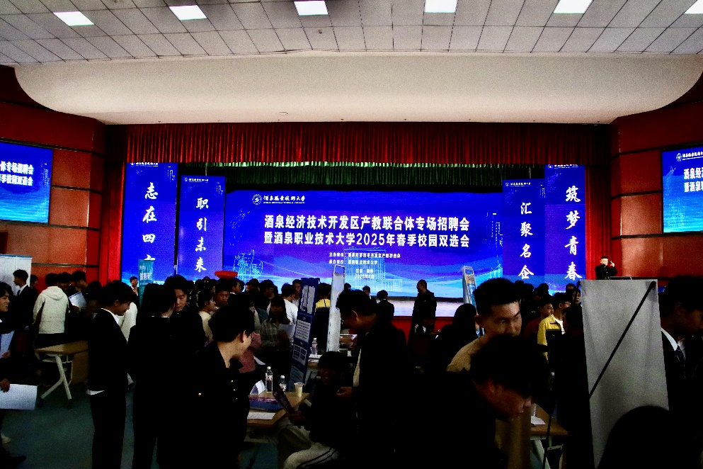 4月26日,酒泉职业技术大学2025年春季校园双选会在胡杨文化活动中心举办,土木工程学院组织2026届毕业生450人参加双选会。