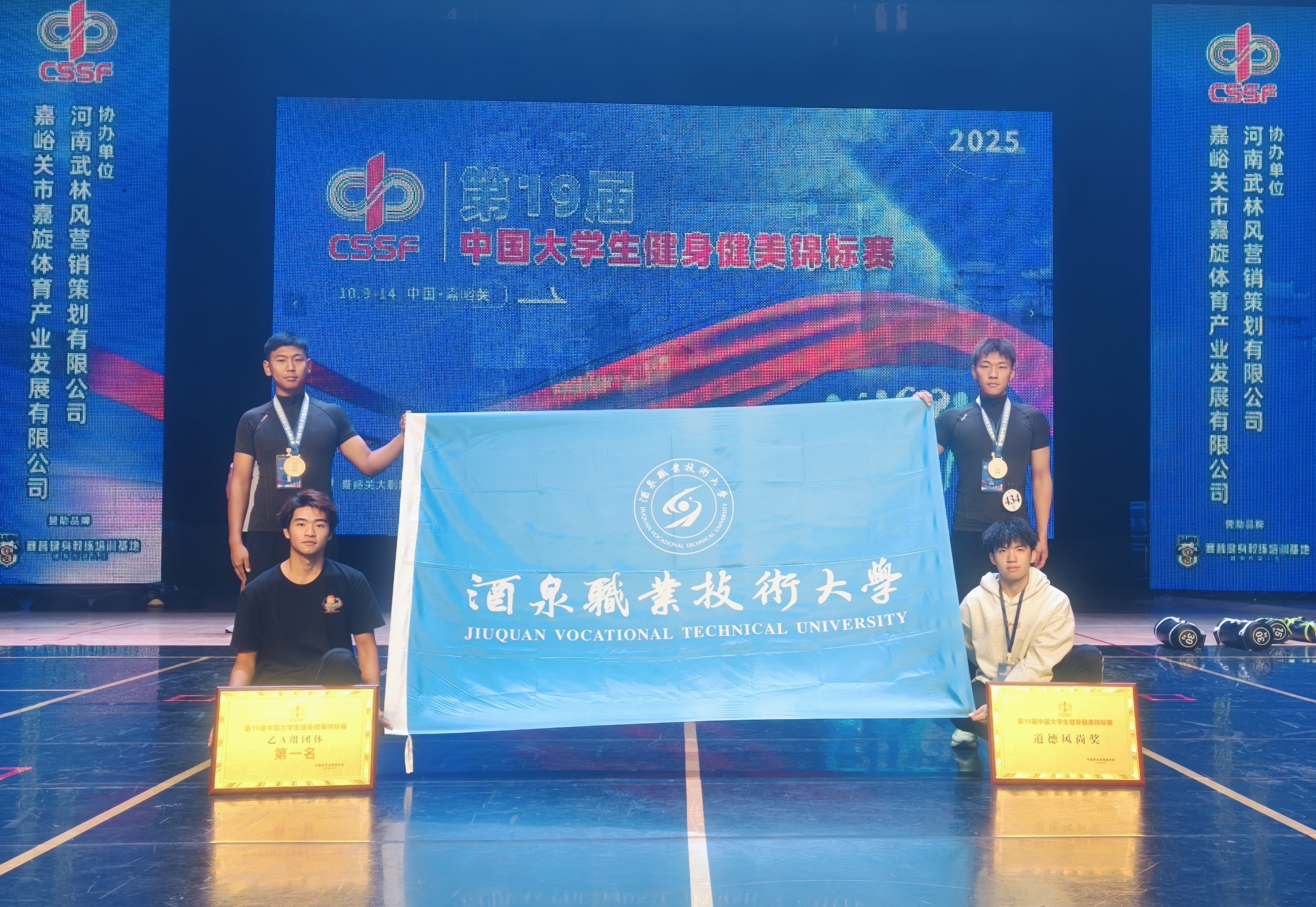 2025年10月12-14日,第十九届中国大学生健身健美锦标赛在甘肃省嘉峪关市盛大举行。酒泉职业技术大学体育与健康学院代表队凭借扎实的功底和出色的发挥,从全国104所高校、872名参赛选手中脱颖而出,荣获乙A组团体总分第二名的优异成绩,并被赛事组委会评为“道德风尚奖”,在全国高校体育竞技舞台上展现了酒泉职业技术大学学子的卓越风采。