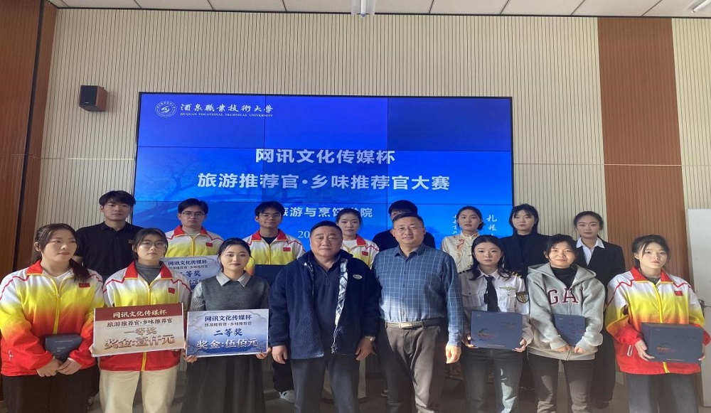 为深化产教融合,激发创新思维,锤炼实践能力,2026年1月6日旅游与烹饪学院举办“网讯文化传媒杯”旅游推荐官·乡味推荐官大赛。本次大赛得到了甘肃网讯文化传媒有限公司董事长刘玮琥先生的大力支持。大赛经过初赛共有十四名选手脱颖而出,在本次决赛中同台竞技,学院党支部副书记、院长刘兴龙、班子成员及旅游管理、研学旅行管理与服务专业的全体教师及2023级旅游管理班、研学旅行管理与服务班的同学观看了本次比赛。