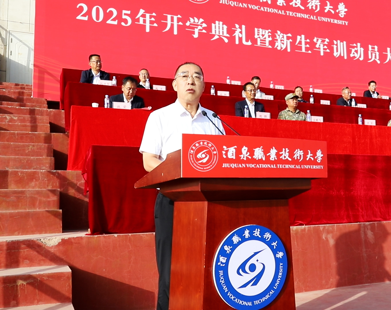 酒泉职业技术大学2025年开学典礼暨新生军训动员大会圆满结束,2025级新生正式开训,将进行为期15天的军训。