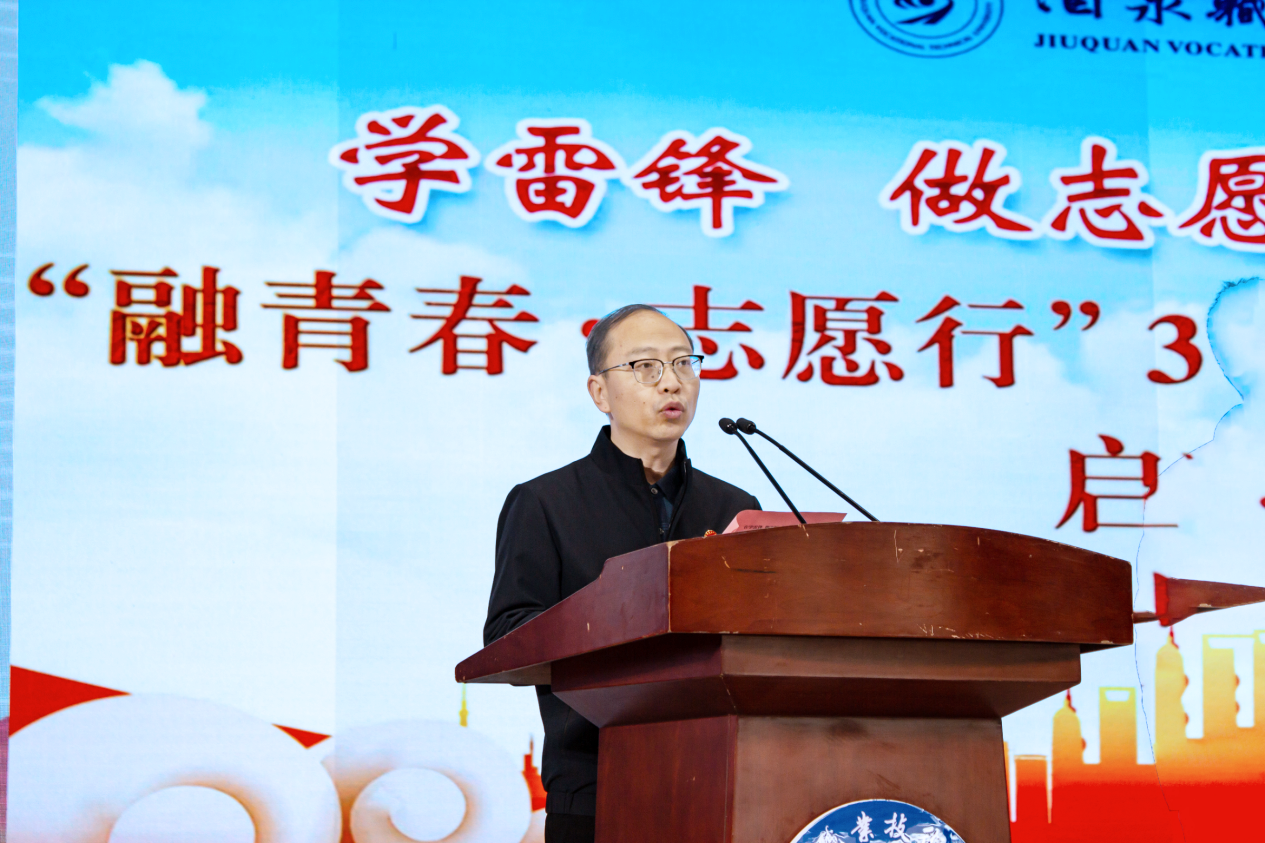 高翔讲话并宣布酒泉职业技术大学2026年“融青春·志愿行”学雷锋志愿服务活动启动。他首先向长期奉献在志愿服务一线的学校师生表示感谢。他指出,2026年是“十五五”开局之年,也是学校推进“双高计划”建设的关键年,新征程上更需深刻把握雷锋精神的时代内涵。他勉励全校师生从自身做起、从专业出发、从身边小事做起,用青春热书写新时代的雷锋故事。同时,向全校青年志愿者提出四点希望:一要筑牢价值根基,结合专业所长创新雷锋精神践行方式;二要聚焦实际需求,推动志愿服务从“量”的积累向“质”的提升转变;三要围绕中心大局,让专业志愿红成为服务地方发展的亮丽名片;四要融入育人全过程,在立德树人中厚植雷锋精神的成长沃土。