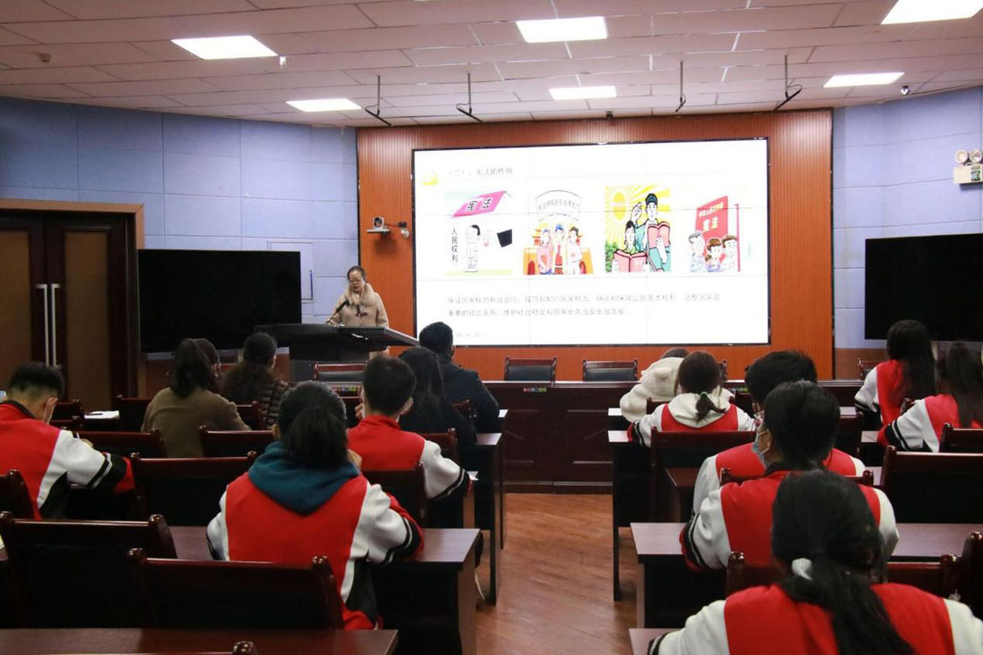 梁月华律师从深刻认识党的二十大的历史地位与重大意义、习近平法治思想、践行习近平法治思想弘扬宪法精神等方面讲述了宪法是国家的根本法,是治国安邦的总章程,是党和人民意志的集中体现,具有最高的法律地位、法律权威、法律效力,具有根本性、全局性、稳定性、长期性。并希望广大同学通过学习自觉成为社会主义法治的遵守者。