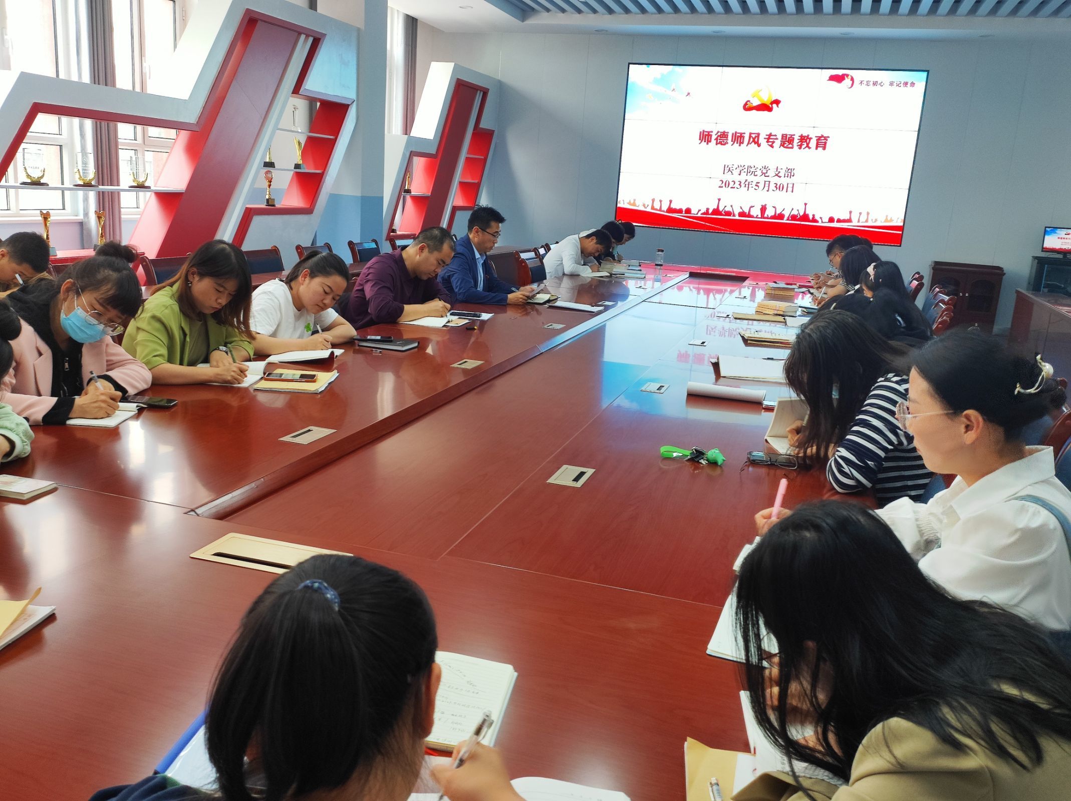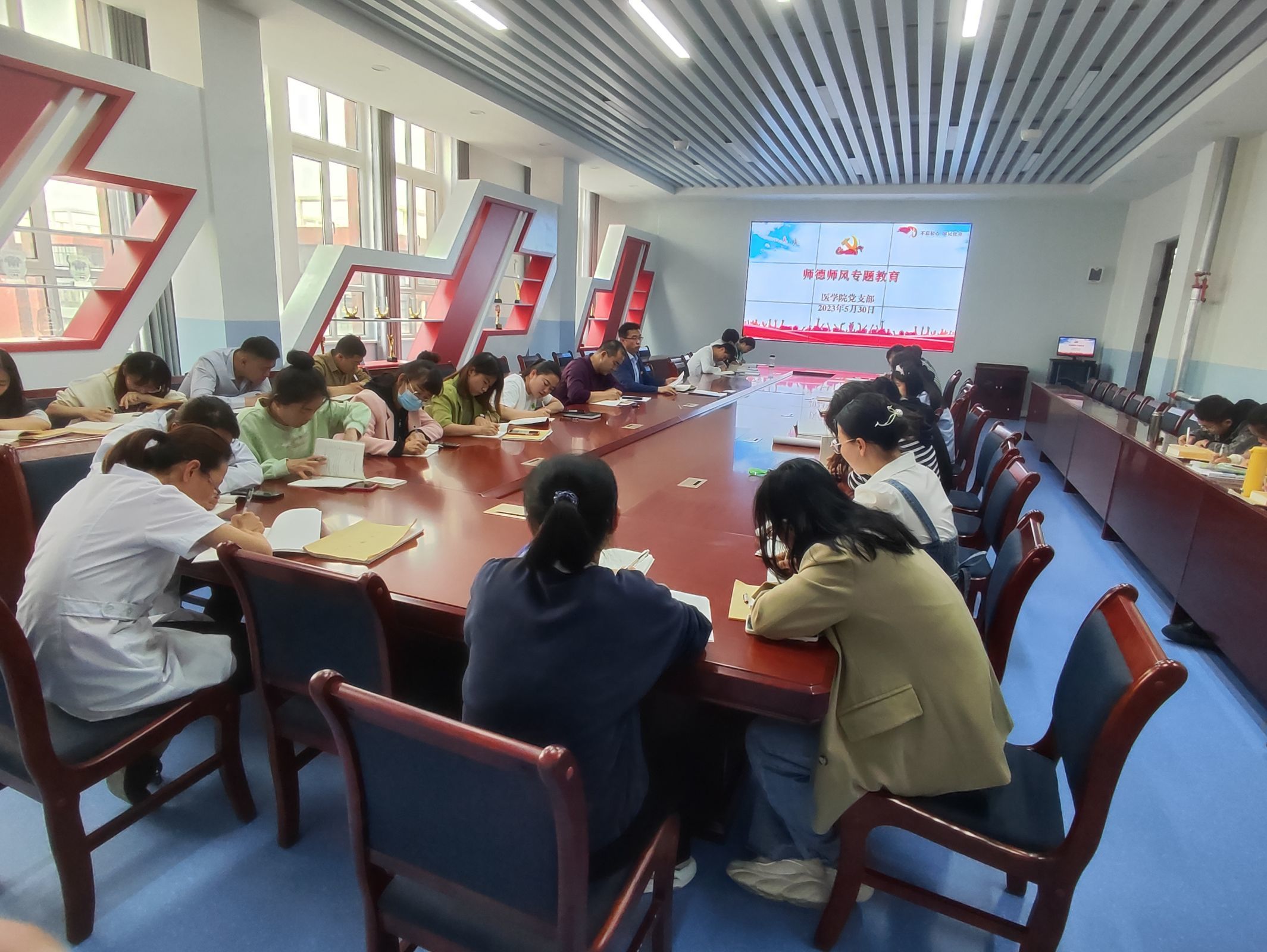为进一步加强教师队伍师德师风建设,全面提升教师思想政治素质和职业道德水平,落实立德树人根本任务,2023年5月30日,医学院组织全体教职工举行师德师风专题教育活动,会议由党支部书记、院长范玉敏主持。