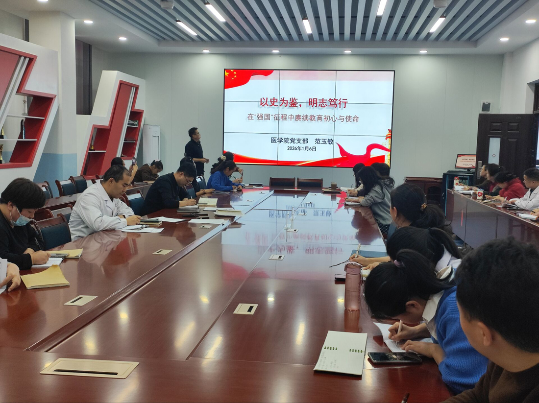 为深入贯彻落实党的教育方针,进一步强化教师队伍的理想信念与时代使命感,2026年1月6日下午,医学院党支部书记范玉敏以《以史为鉴,明志笃行——在“强国”征程中赓续教育初心与使命》为题,为学院全体教职工讲授专题党课。
